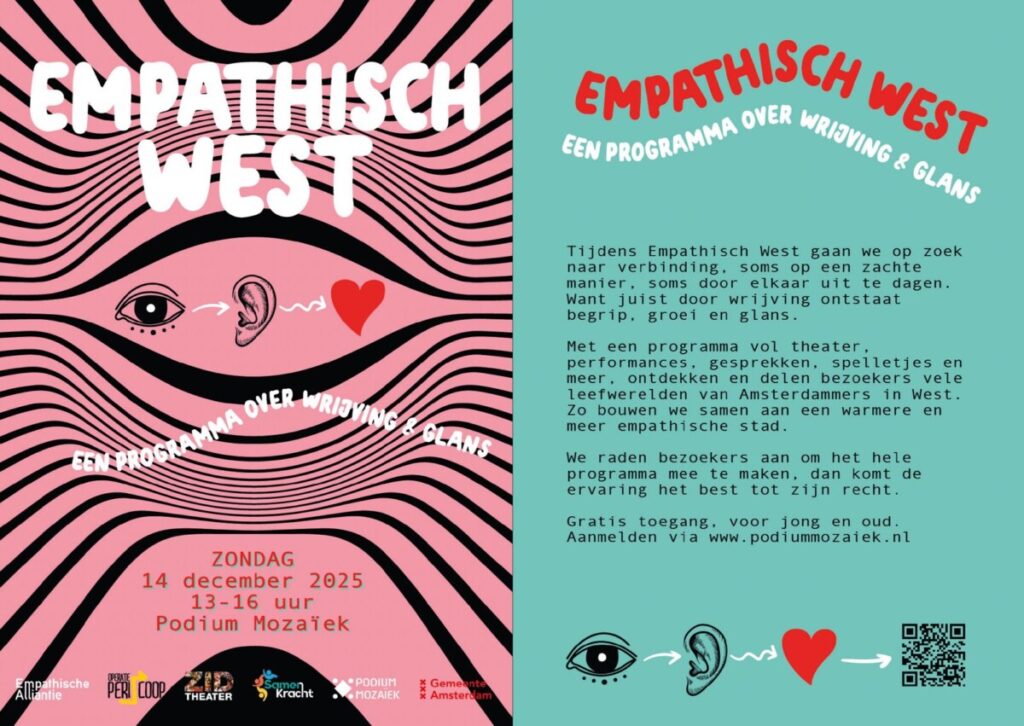 Tijdens Empathisch West gaan we op zoek naar verbinding, soms op een zachte manier, soms door elkaar uit te dagen. Voor jong, oud en iedereen daartussen. Want juist door wrijving ontstaat begrip, groei en glans. Het programma bestaat uit performances, gesprekken, spelletjes en meer die de leefwerelden van Amsterdam West bij elkaar brengen: samen op weg naar een warmere en meer empathische stad! Scenes uit de voorstelling ZUURSTOF brengen mens en natuur dichter bij elkaar. We raden aan om het hele programma bij te wonen, dan komt de ervaring het best tot zijn recht.
